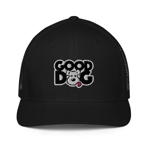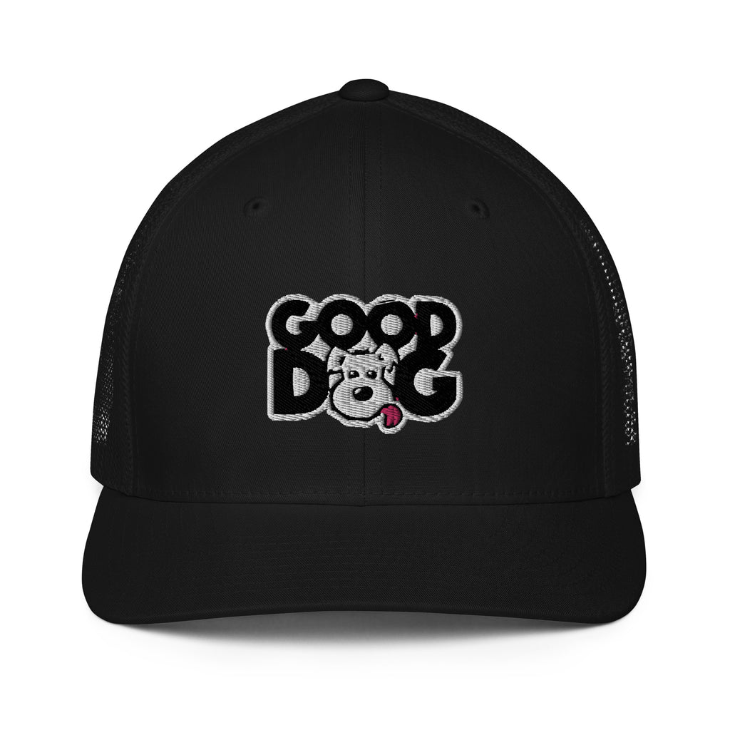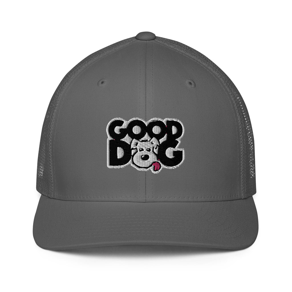 Good Dog Activewear This classic mesh back trucker cap is iconic and timeless. It's mesh back ensures maximum comfort and breathability. .: 55% polyester, 43% cotton, 2% spandex.: Reinforced front and curved peak.: Silver under visor.: Mesh back and elastic band